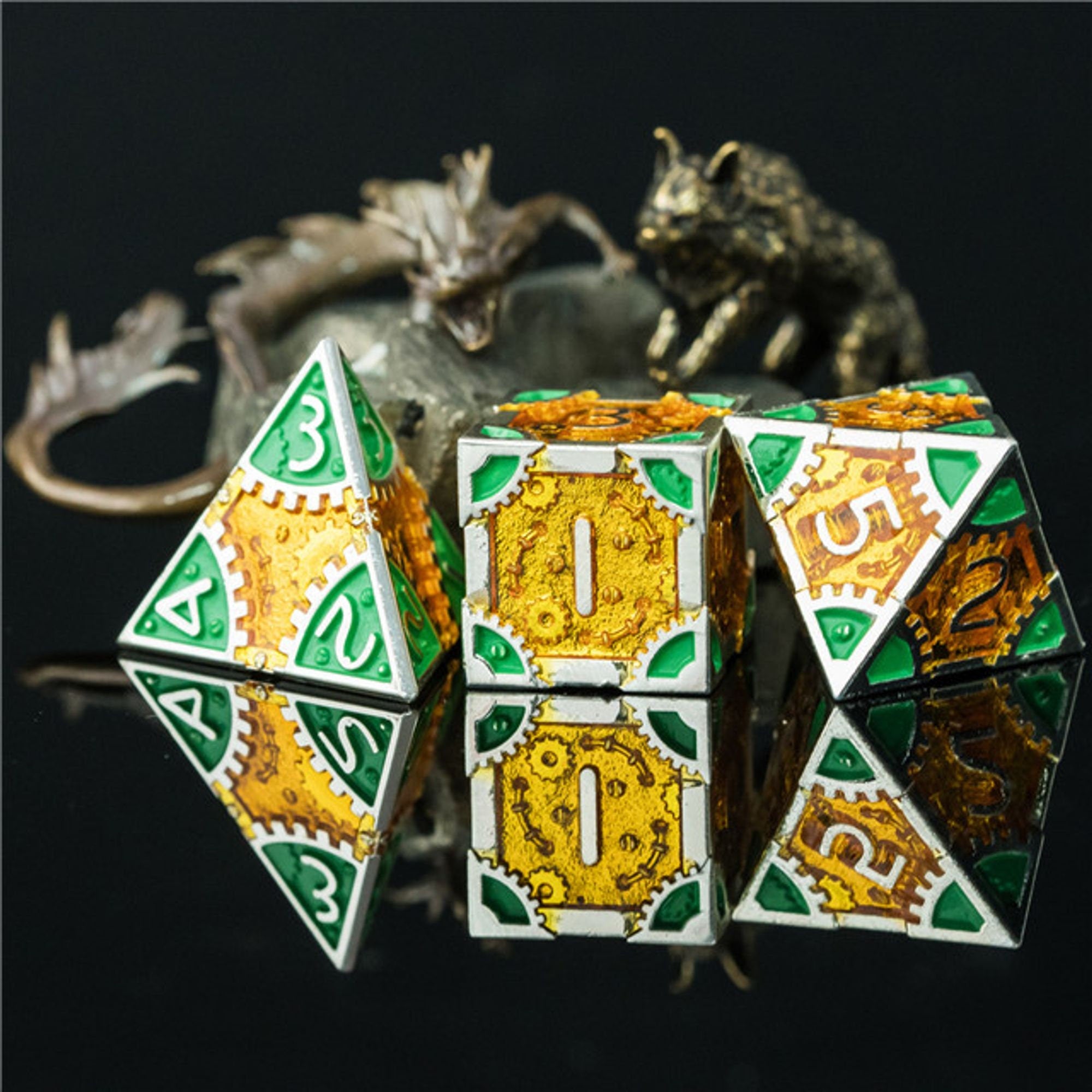 Steampunk Chaos Engine Golden Orange Metal Rogue Style DND/TTRPG Dice set